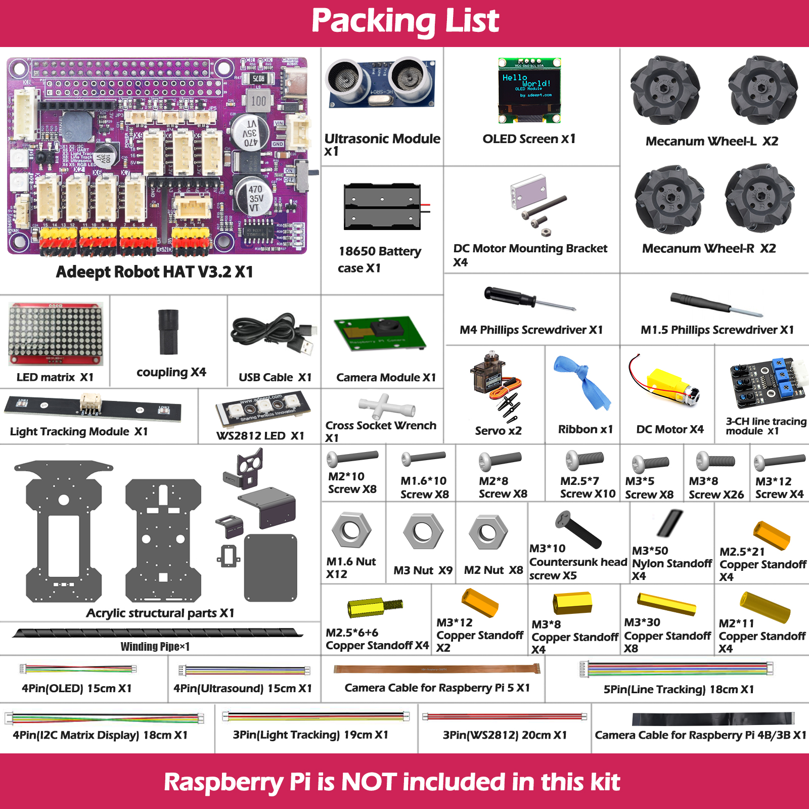 - Mecanum Wheels Car Kit, each wheel can be driven independently, it can move in many incredible ways. This Smart Car Kit is designed for students to learn to coding, building and robotics. Compatible with Raspberry Pi 5/4B/3B/3B+(Raspberry Pi NOT Included!).